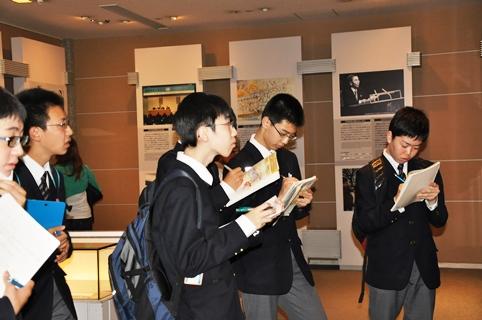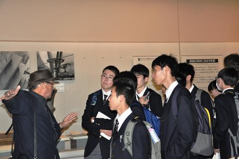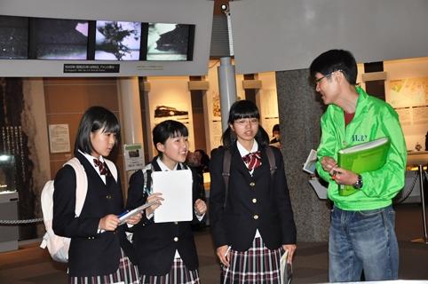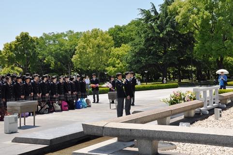 1日目は広島市での平和学習。生徒代表による「平和の誓い」、献花、黙とうのセレモニーの後、平和記念資料館見学、ボランティアガイドによる慰霊碑めぐりを行いました。資料館の見学では、事前学習で学校に来ていただいた葉佐井博巳先生にもガイドしていただく機会がありました。宿舎ではこの日の思いを記録し、発表する場を設けました。