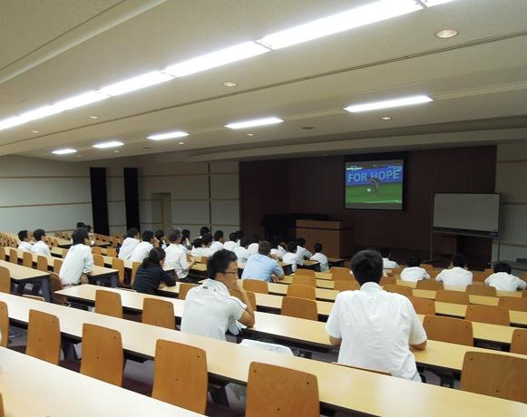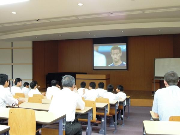 6月20日(金)、サッカーワールドカップのギリシャ戦をサッカー部の提案で、ベルホールのスクリーンで観戦しました。朝7時開始にもかかわらず多くの部員が参加。授業の関係で前半しか観ることができませんでしたが、部員以外の生徒や教員も参加し、皆で応援しました。