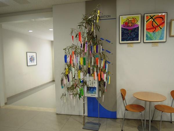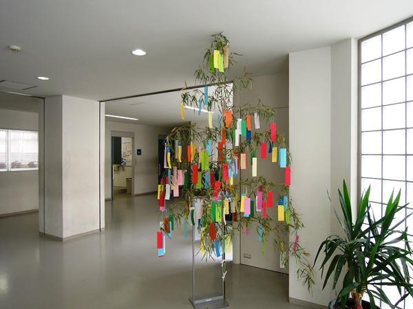 6号館の2階ラウンジに山からとってきた笹、そして傍らのテーブルに糸をつけた短冊とペンを置きました。その日のうちに笹は色とりどりの短冊でたわわ。6年生のフロアに置いたので、さすがに「第一志望合格」の類が目立ちました。