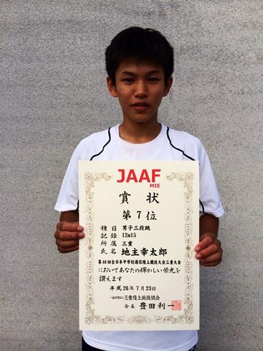[陸上競技部] 7月23日(水)に行われた第60回全日本中学校通信陸上競技大会三重大会において、地主幸太郎君(2年)が自今記録を更新し、7位入賞を果たしました。