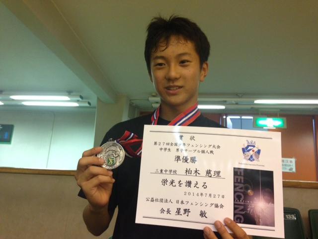 [フェンシング] 7月27日(日)に東京で行われた第27回全国少年フェンシング大会において、柏木慈理君(3年)が中学生男子サーブル個人戦で準優勝に輝きました。この結果柏木君は全日本ジュニア代表に選ばれました。