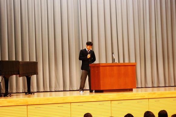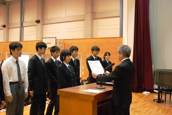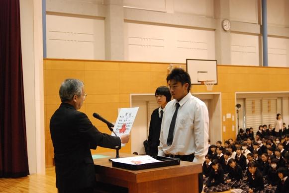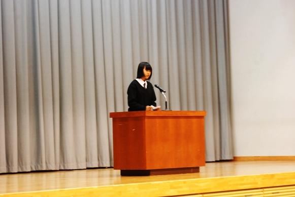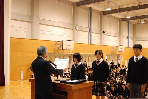10月22日(水)、10月の朝礼が行われました。先ず9月8日から六年制高校部で学んでいる日中交流センター留学生 陳 鋆(ちん いん)さんの挨拶があり、続いて11月にブルガリアで行われるフェンシング国際大会に日本代表として出場する柏木 慈理君の激励がありました。その後、9月以降各分野で活躍した生徒の伝達表彰があり、その中で松阪市の政策コンテストで見事最優秀に輝いた高校部の三重6SCチームのプレゼンテーションが行われました。