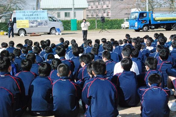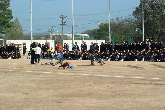 11月7日(金)、松阪市が市内の各中学校で実施しているスタントマンによる「スケアード・ストレート交通安全教室」が地域の方も参加して三重中学校で行われました。「スケアード・ストレート」は「恐怖の直視」という意味で、スタントマンによる交通事故現場の再現を通して事故の恐ろしさを実感することで危険行為を未然に防ぎ、交通ルールの大切さを学ぶことを目的としています。