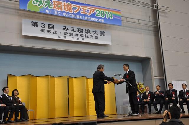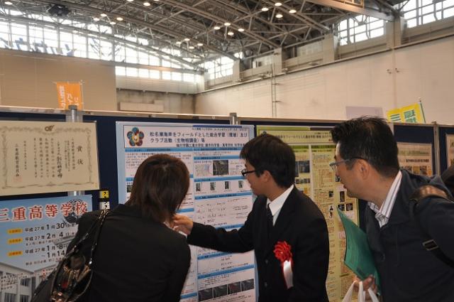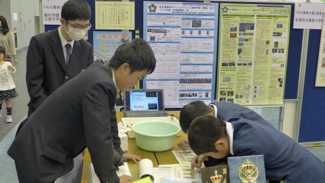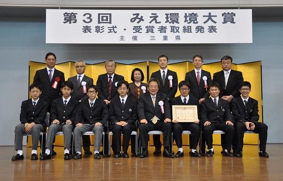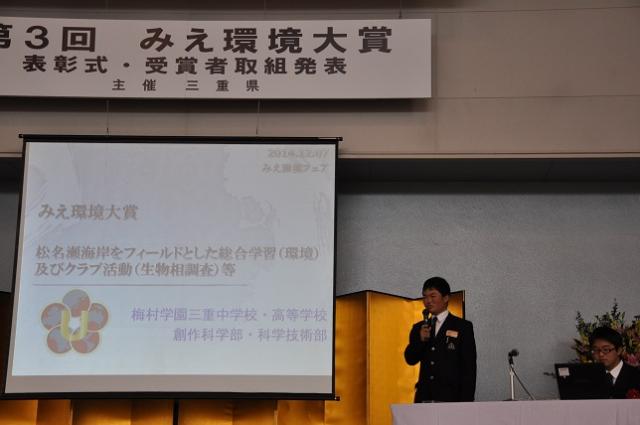 三重中学校・高等学校は、松阪市の松名瀬海岸における中学1年生による環境活動及び中高の科学系クラブによる調査・研究活動が評価され、「第3回 みえ環境大賞」を受賞することになりましたが、12月7日(日)その表彰式が行われました。会場のメッセウィングみえでは、表彰式に続いて科学系クラブの生徒による活動報告があり、また同時に受賞団体がそれぞれのブースで展示を行いました。