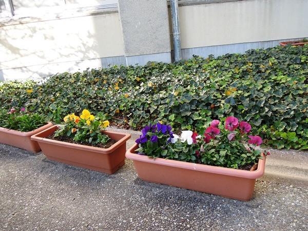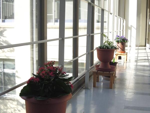 渡り廊下にはスクールカラーの三色の花が年中絶えません