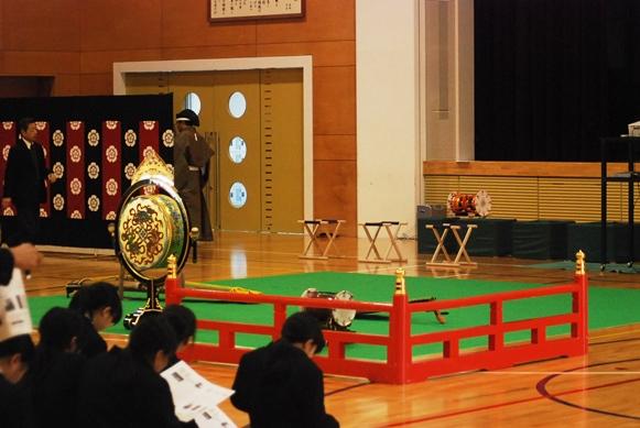 まず映像で雅楽の紹介、楽器の紹介があり、その後演奏、楽器体験と続きました。ほとんどの生徒にとって雅楽を鑑賞するのは初めてで、凛とした空気の中を流れる音色に聞き入っていました。体験ではできるだけ多くの生徒が多くの楽器を演奏できるよう配慮されており、充実した特別授業となりました。