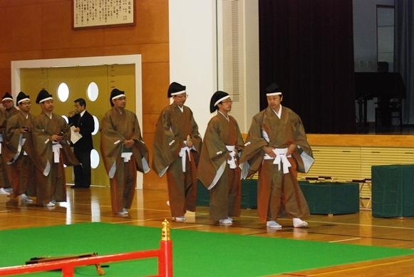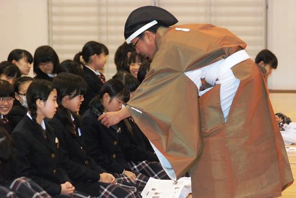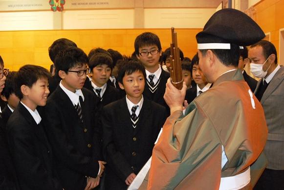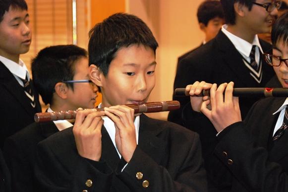 三重中学校では日本の古典音楽に親しむ機会として1年生で雅楽を、2年生で能楽囃子を体験しますが、1年生の『雅楽鑑賞体験教室』が、演奏家の団体「雅結会(がゆうかい)」の皆さんをお招きして、12月13日(土)に行われました。