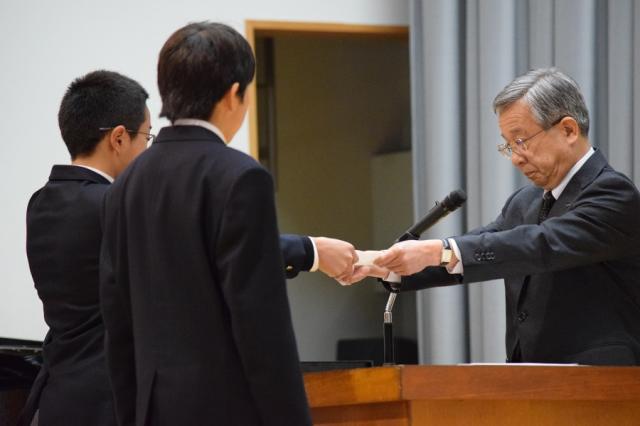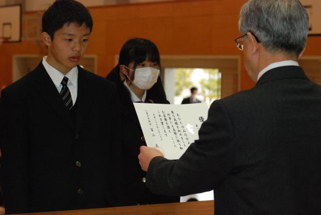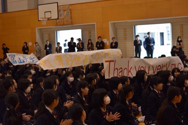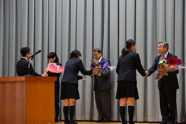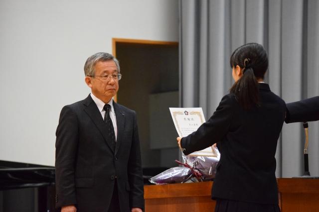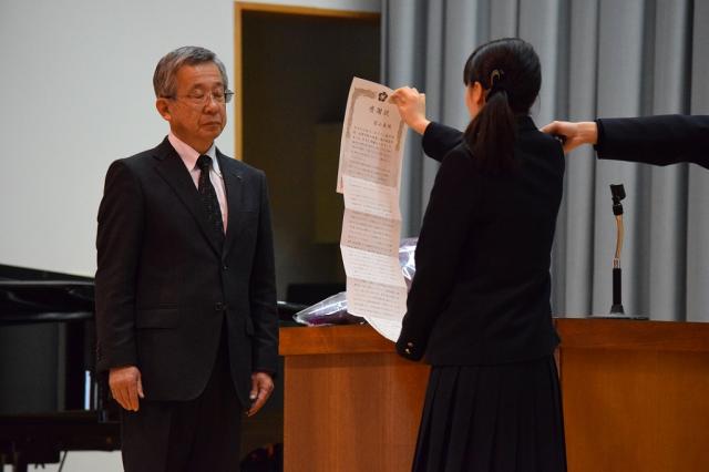 平成27年3月20日(金),3学期終業式が,冨山校長先生の訓示から始まりました。先輩のエピソードから建学の精神を体現することの重み教えていただき,最後の訓示となりました。その後,離任式も終わったところで,生徒会によるサプライズ表彰式が行われ,生徒会長から校長先生に長文にわたる感謝状(写真参照)が贈られました。会場には横断幕も出て,私たち生徒,教職員の記憶の残る離任式となりました。