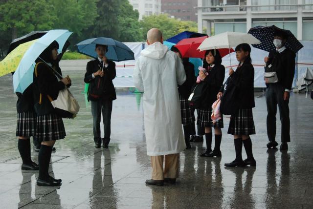 1日目は広島市での平和学習が行われましたが、天気に恵まれず、雨の中の研修となりました。生徒代表による「平和の誓い」、献花、黙とうのセレモニーの後、平和記念館見学、ボランティアガイドによる慰霊碑めぐりを行いました。宿舎では平和について学習した内容を発表する場を設けました。