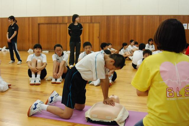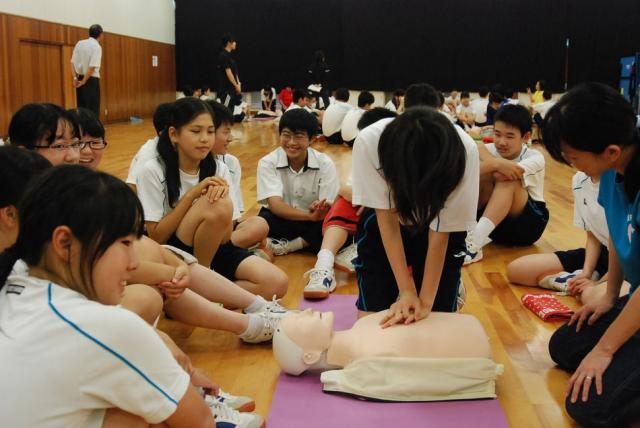 7月7日(火)、市立伊勢総合病院から看護師の方をお招きし、2年生対象に『救急法講習会』が行われました。AEDを使っての心臓蘇生を中心とした救急処置を一人一人が実際に体験を通じて学びました。