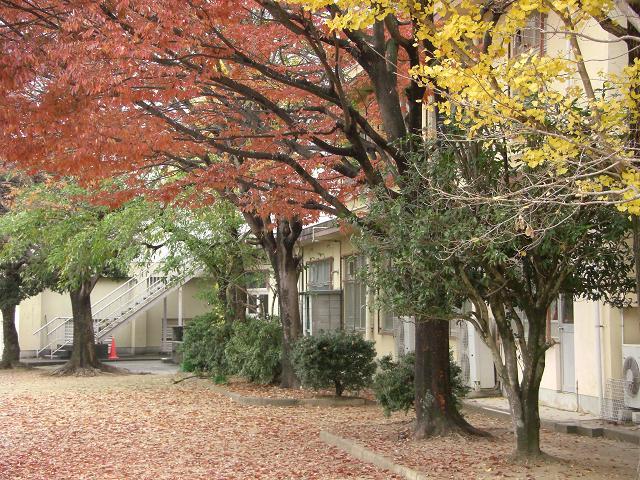 中学旧校舎の木々がすっかり紅葉しました。掃除当番受難の季節の到来です。