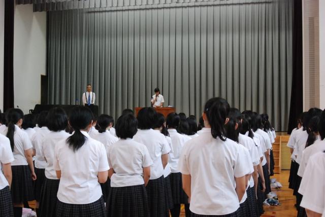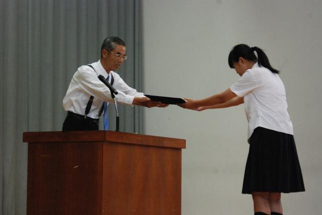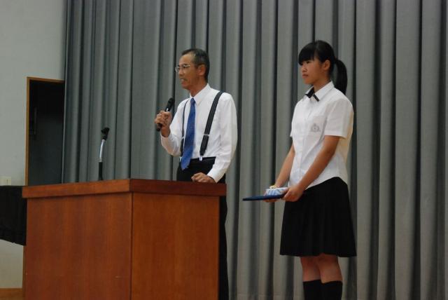 2014年9月から約1年間三重高校六年制高等部で学んできた日中交流センターの留学生陳鋆さんの帰国にあたり、7月10日(金)、六年制の中高生全員の出席の下、修了証書授与式が行われました。