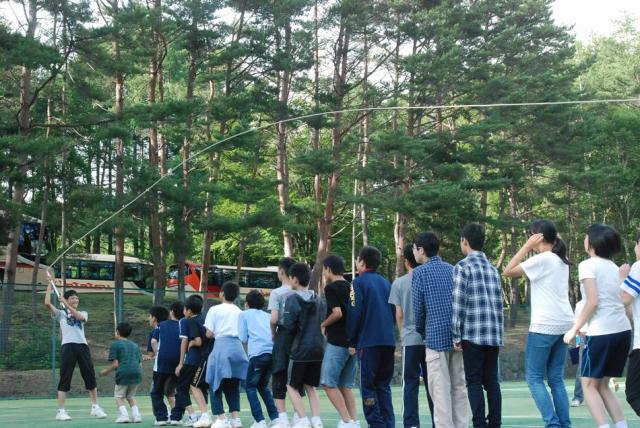 結団式と開校式の後,自然観察とスポーツレクリエーションのチームに分かれて活動しました。その後,クラス対抗大縄跳びをしました。