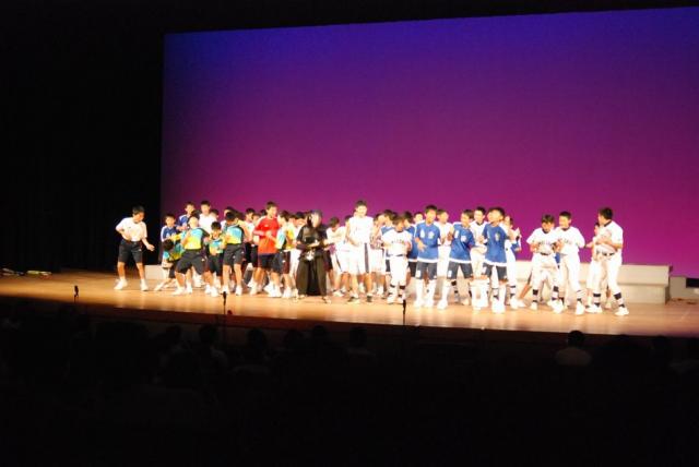 中学行事(舞台発表)は、クラブによる発表、学年による演劇やダンスなどのパフォーマンスを楽しみました。オープニングでは、毎年、生徒会メンバーが工夫をこらした企画をします。今年は、書道パフォーマンスを行い、会場を盛り上げてくれました。また、1年生男子による部活を活かした迫力あるダンスなどを披露しました。
