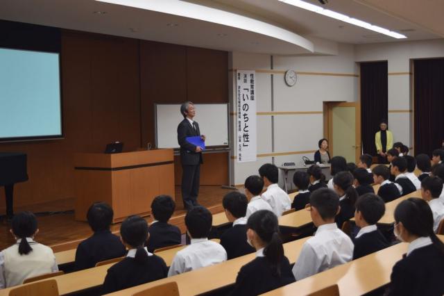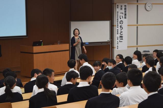 10月29日(木)、1年生で性教育講座「いのちと性」が、済生会松阪総合病院の助産師、山本久代先生をお招きし、行われました。「あなたのいのちの重さ、あたたかさ、やさしさを共に考えてみましょう。」というテーマで1時間講演していただきました。思春期の悩みの話から生命の誕生の話まで分かりやすく、かつ真剣に講演していただきました。