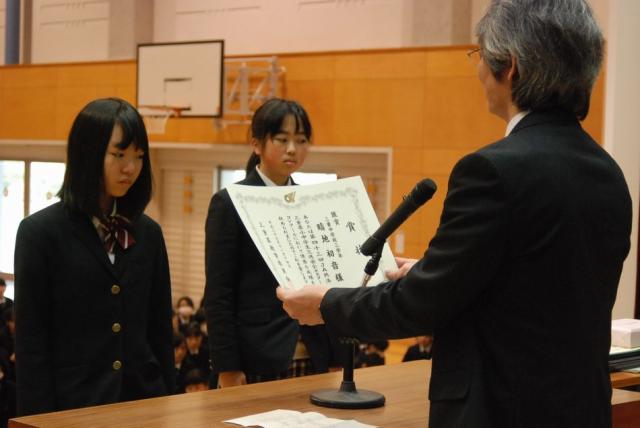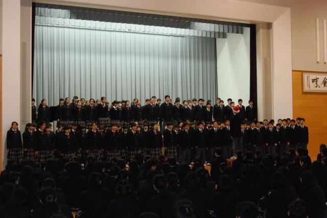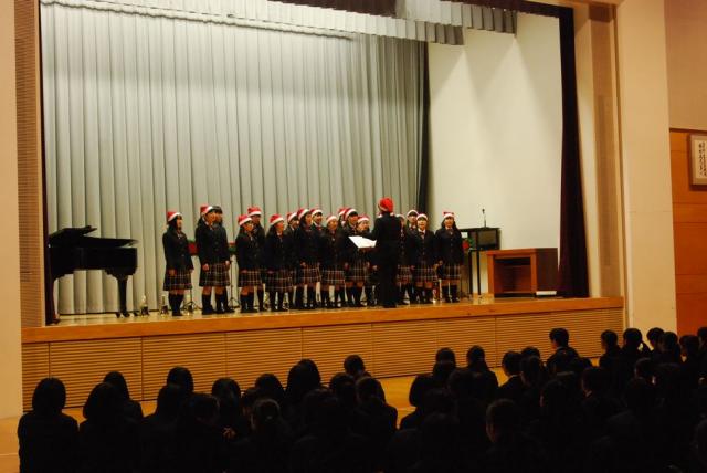 12月22日(火)、第2学期終業式と恒例の生徒会によるクリスマスコンサートが行われました。終業式では文化面で活躍した生徒の伝達表彰が行われました。校長訓辞の後、大きな歌声が体育館をつつみ、校歌斉唱で終業式を終えました。