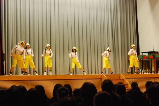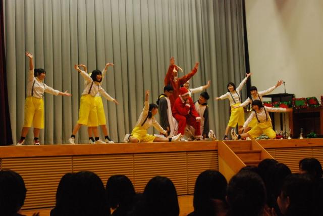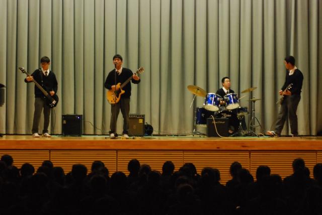 終業式の後、行われた生徒会主催のクリスマスコンサートでは、オープニングに有志のダンスパフォーマンスがあり、次に音楽部による、ピアノの連弾による「情熱大陸」の演奏から始まり、恒例のハンドベルの演奏、ジブリの「君をのせて」を合唱し、生徒たちは、美しい歌声に聞き入っていました。その後、有志のバンド演奏があり、最後のトリに、1年生全員による合唱で締めくくりました。