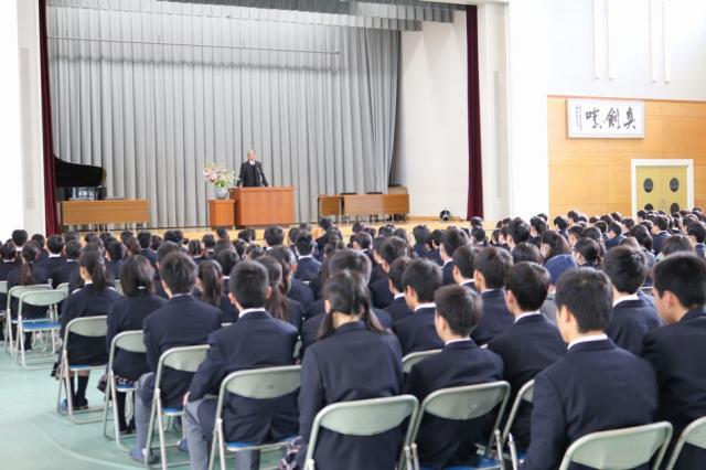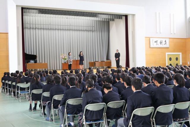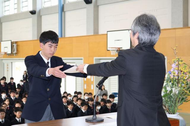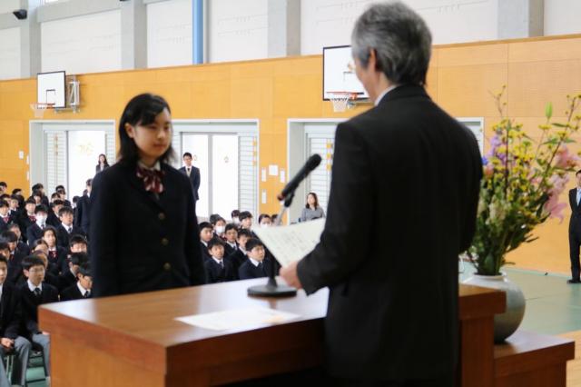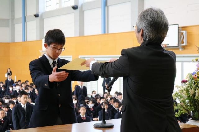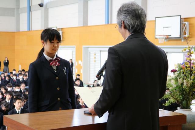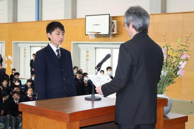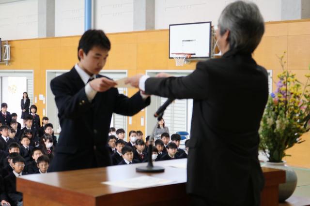 3月18日(金)、3学期終業式が行われました。野田校長先生の訓辞から始まり、2年生による伴奏で中学校歌を歌いました。また、今年度の優等賞や精勤賞など各賞授与があり、優等賞2年生12名、1年生12名、精勤賞2年生56名、1年生63名が受賞しました。この他、伝達表彰が行われました。終業式の後、離任式が行われ、退職される先生方より挨拶の言葉をいただき、今年度最後の式を終えました。