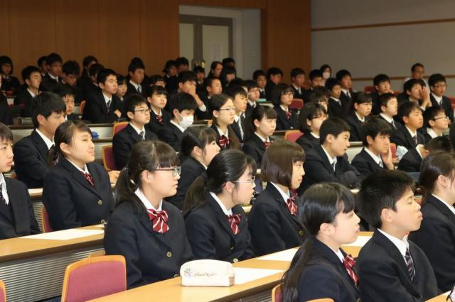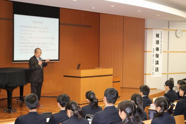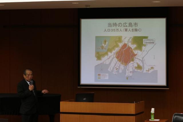 中学3年生は5月16日から中国・四国地方へ研修旅行に出発し、第1日目に広島で平和学習を行いますが、その事前研修として『被爆体験講話』がありました。今年も広島大学名誉教授の葉佐井博巳先生をお招きしました。広島の地図を用いて、爆弾が落とされた時どこでどのような事が起こり、何を目にしたかということを科学的な見地を交えながら、お話していただきました。生徒たちは、葉佐井先生が体験された話を、真剣に聞き入っていました。