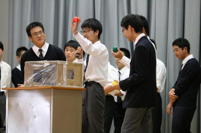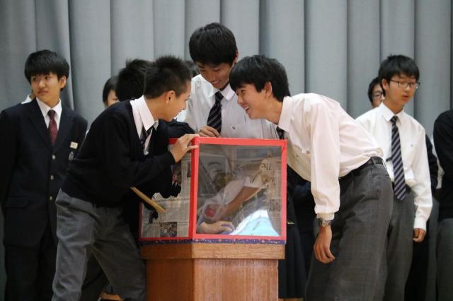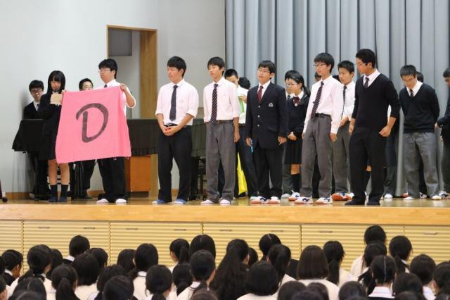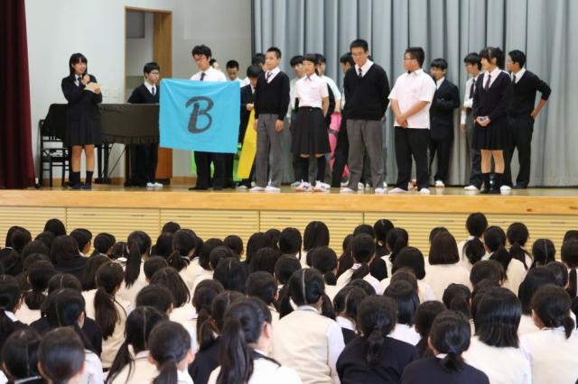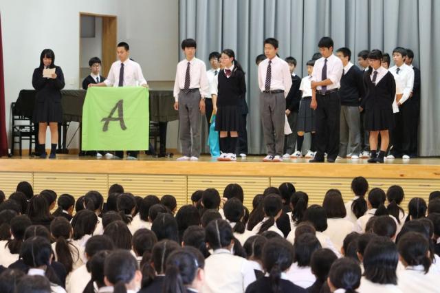 6月に行われる体育祭に向けて、チーム色分けの抽選会が行われました。六年制の体育祭は中高の各学年を縦割りし、4チーム対抗で行っています。そのチーム分けは、代表者が生徒会室で抽選を行い決めていました。しかし、今年は生徒全員が体育館に集まり、チーム分けの抽選会をみんなの前で披露しました。抽選会は、大いに盛り上がり、体育祭に向けての士気を高めました。