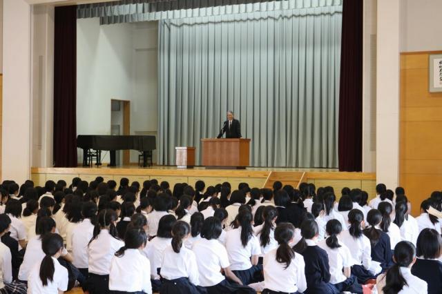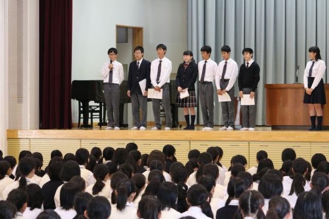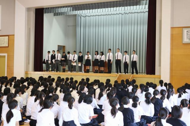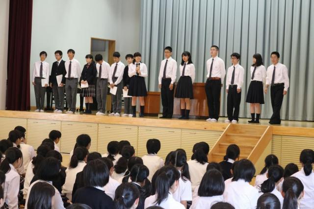 5月23日(月)、5月の朝礼が行われました。校長訓話に続いて前期生徒会役員・クラス役員の任命があり、中高それぞれの生徒会長の所信表明と役員紹介がありました。