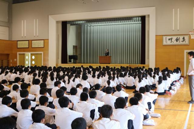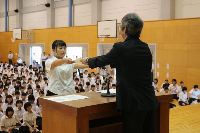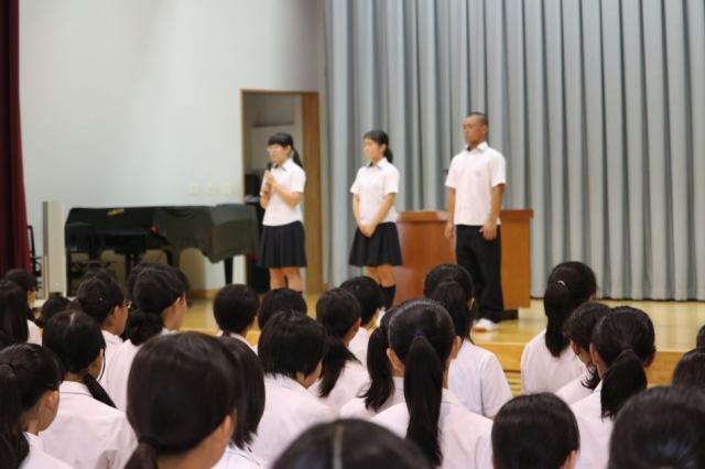 7月20日(水)に1学期終業式が行われました。全国大会に出場する高校のクラブ代表者が抱負を述べ、中学生は激励の拍手をおくりました。