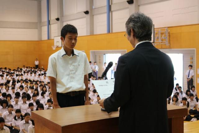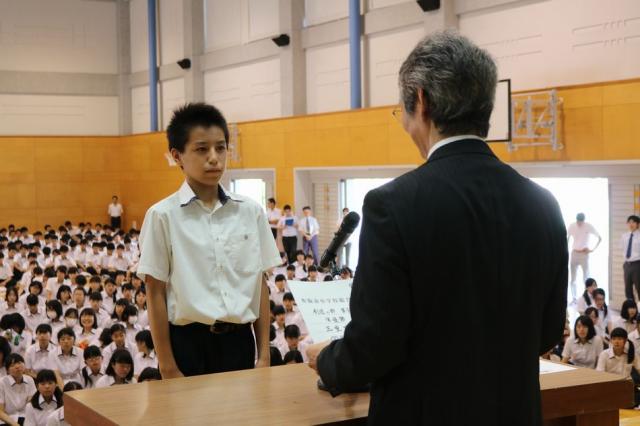 式後には、中学部の伝達表彰が行われました。また、生徒指導部から夏休みの過ごし方に関する注意がありました。伝達表彰は、以下の通りです。