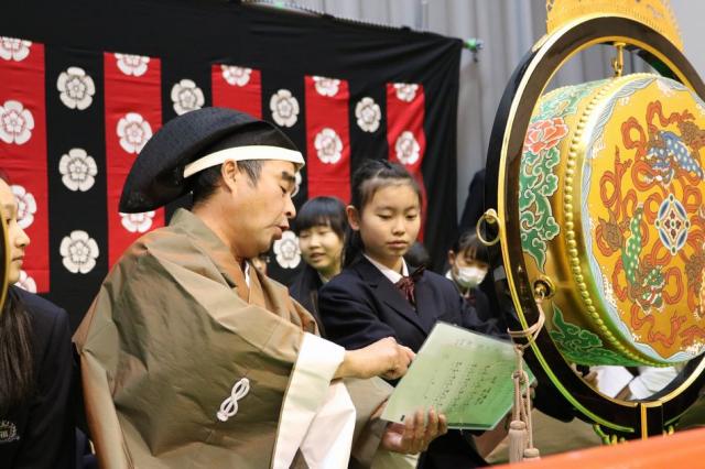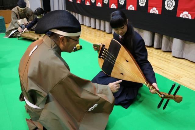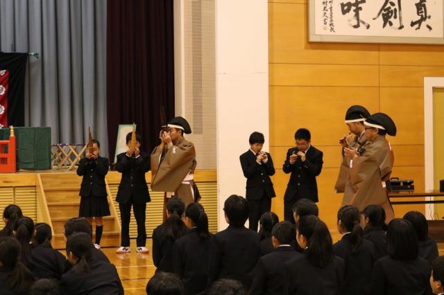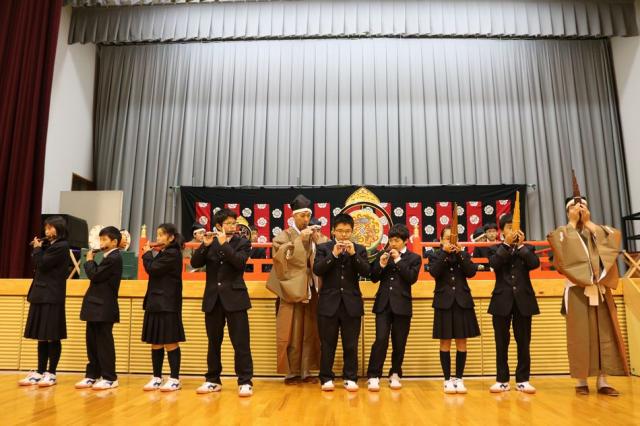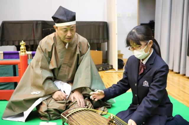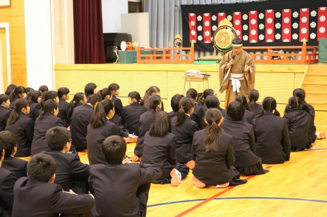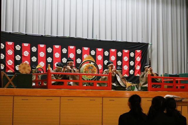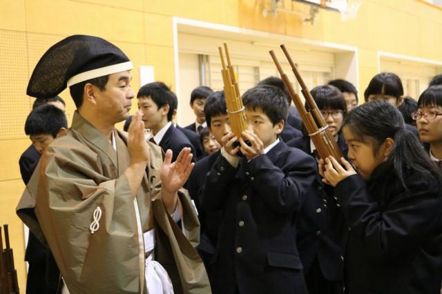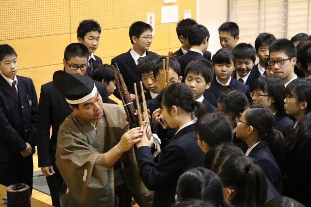 12月7日(水)、1年生を対象として音楽科特別授業『雅楽体験教室』が行われました。この特別授業は日本の古典音楽に触れる目的で実施されているもので、今年度も「雅結会(がゆうかい)」の皆さんをお招きし、楽器体験と演奏の観賞を中心に行いました。雅楽の演奏を聴くだけでなく、実際に笙(しょう)や篳篥(ひちりき)などの演奏を体験することもでき、生徒たちは雅楽の世界を十分に満喫している様子でした。