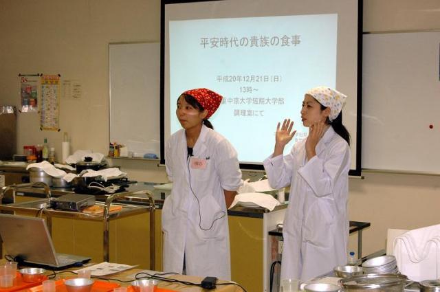 斎宮歴史博物館・三重中京大学短期大学部の指導の下、2013年の伊勢神宮の神宮式年遷宮に向けて平安時代の斎宮の食再現のプロジェクトが始まりました。12月21日(日)、創作科学部の生徒8名と三重高等学校の調理部の生徒2名が、三重中京大学短期大学部の調理実習で平安時代の貴族の日常食の再現に参加しました。今回の献立は、むかご入り玄米・サンマのなれ鮨・粉熟(ふずく 平安時代の米菓子)・蘇・ところてん・干し柿でした。素材の味を大切にした素朴な味で、生徒達は楽しみながら作り、おいしく食べました。