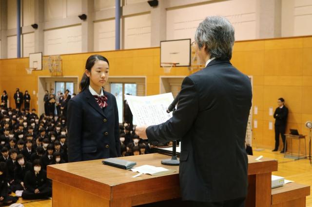 12月22日(木)、第2学期終業式と恒例の生徒会によるクリスマスコンサートが行われました。終業式では文化面で活躍した生徒の伝達表彰が行われました。校長訓辞の後、代表生徒が壇上に上がり、校歌を盛り上げました。大きな歌声が体育館をつつみ、校歌斉唱で終業式を終えました。