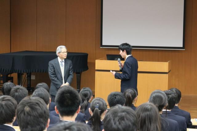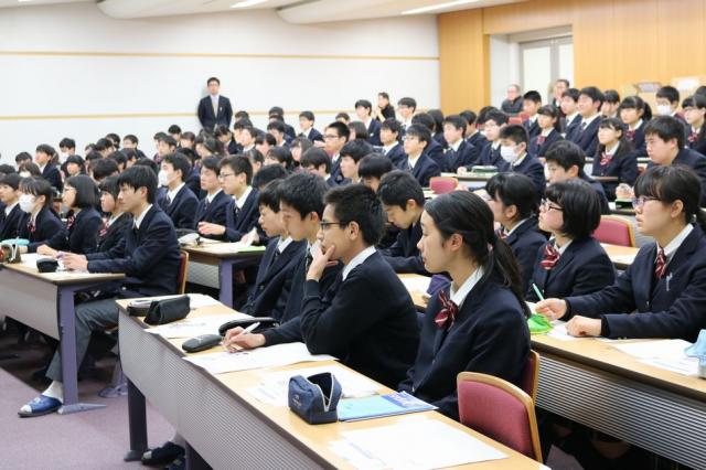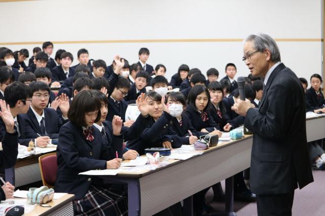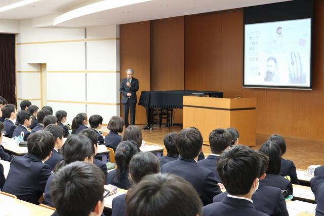 2月7日(火)に、中学3年生で放射線に関する特別授業を行いました。名古屋大学名誉教授の森 千鶴夫先生をお招きし、ベルホールで2時間にわたり、講義と実験を行っていただきました。