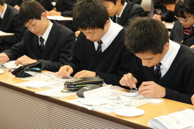 実験では、放射線が空気中を飛んでいることを間接的に観察できる「霧箱」という装置を各自が作成しました。観察できた生徒たちからは歓声が上がり、笑顔が見受けられました。また、放射線量測定器「はかるくん」の使用方法を紹介していただき、後日各クラスの理科担当教員によって放射線量測定実験を行いました。