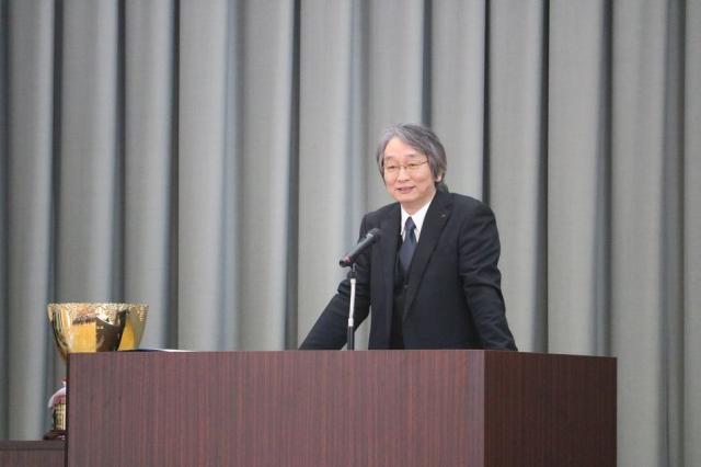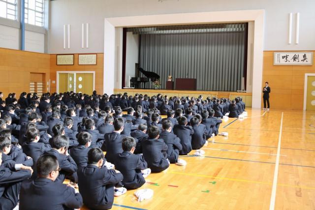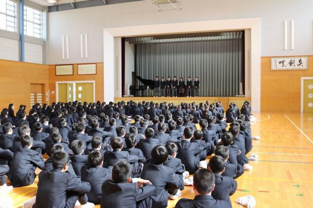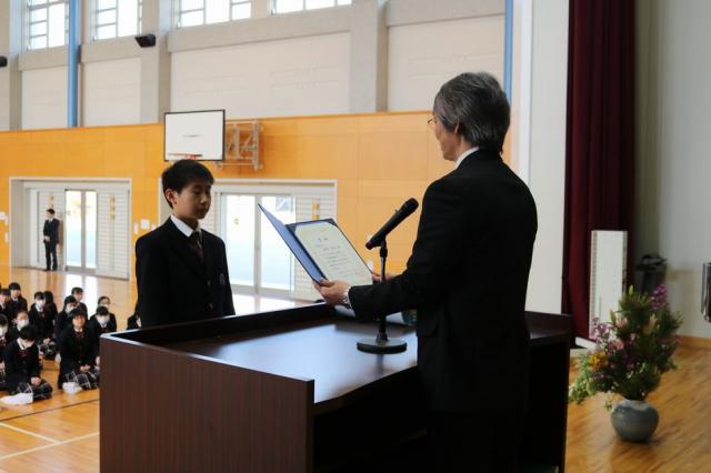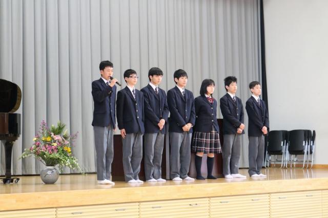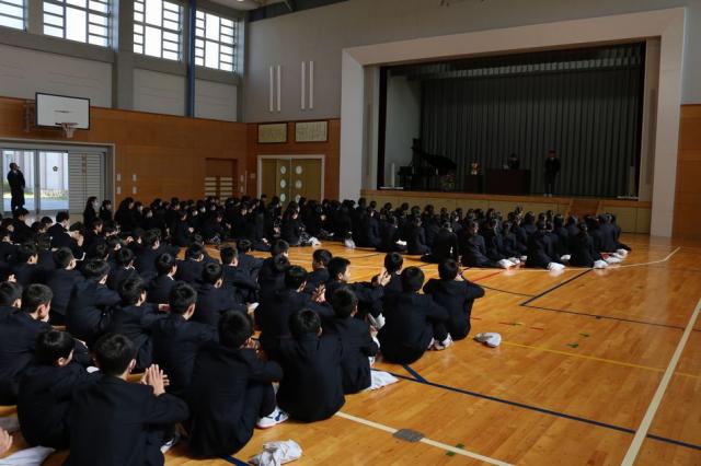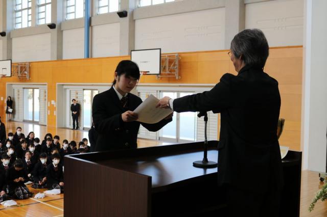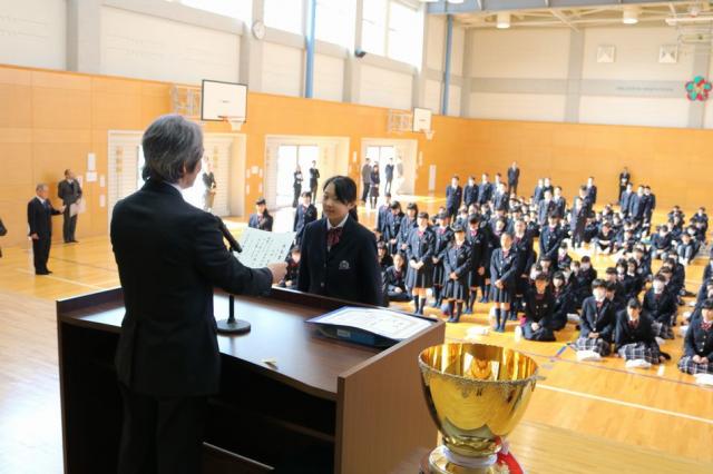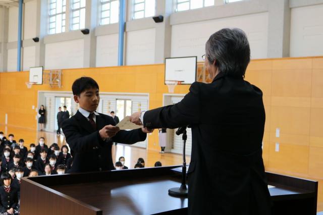 3月18日(土)、3学期終業式が行われました。野田校長先生の訓辞から始まり、2年生による伴奏で中学校歌を歌いました。また、今年度の優等賞や精勤賞など各賞授与があり、優等賞2年生12名、1年生13名、精勤賞2年生58名、1年生45名が受賞しました。この他、伝達表彰が行われました。
