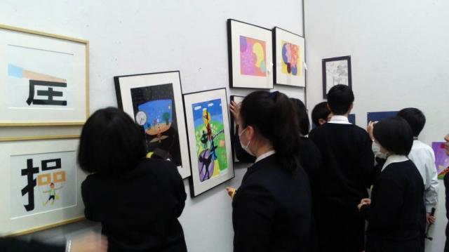 三重県下の私学が合同で行う展覧会で、他校の生徒から刺激を受けながら、展覧会を楽しみました。搬入作業に参加した生徒たちは、美術館のバックヤードに入ることができ、作品の運搬のための大きなエレベーターを使ってみたりと、良い体験にもなりました。