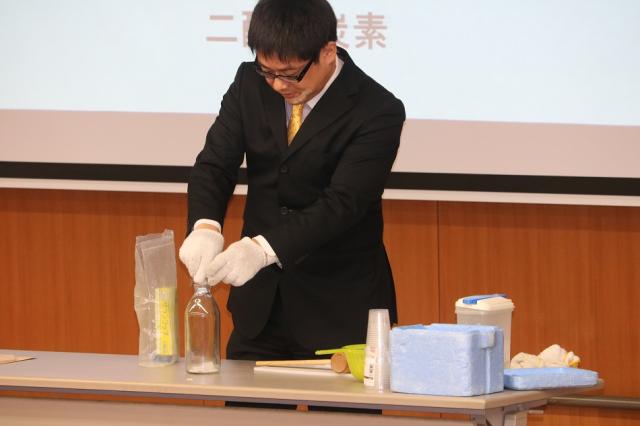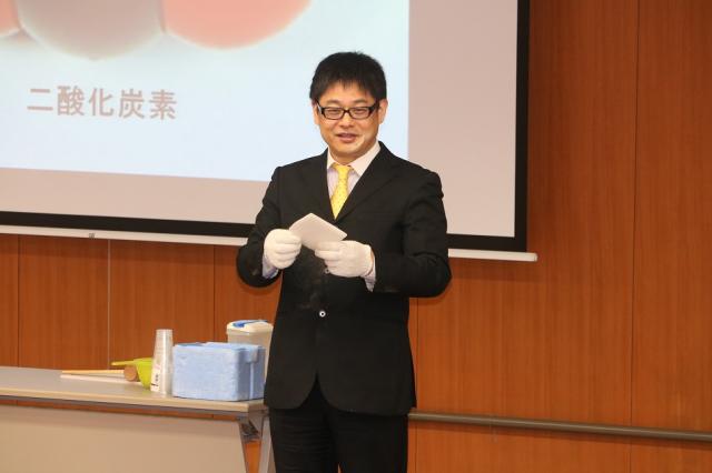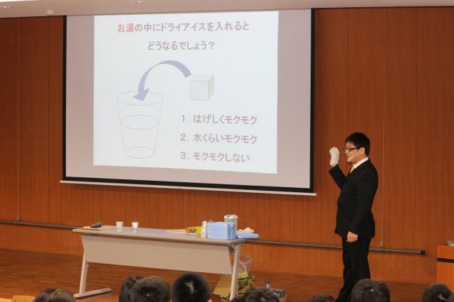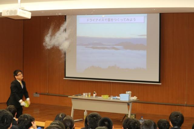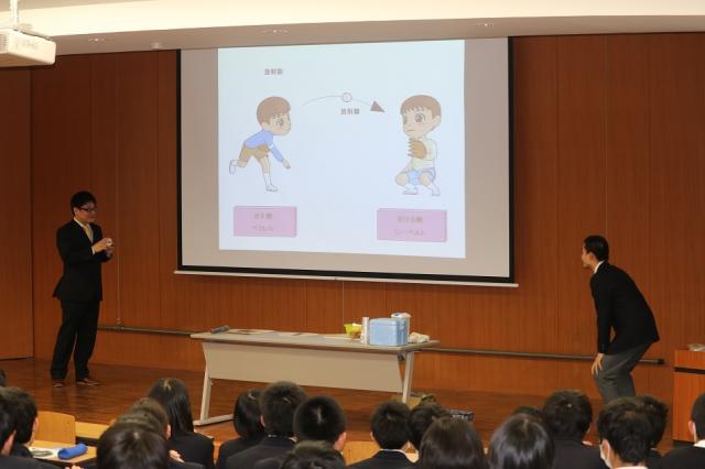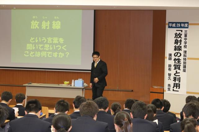 2月6日(火)に、中学3年生で放射線に関する特別授業を行いました。日本科学技術振興財団の掛布智久先生をお招きし、ベルホールで2時間にわたり、講義と実験を行っていただきました。