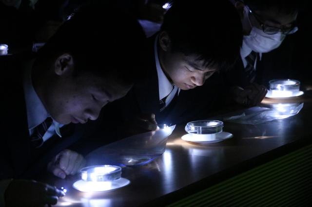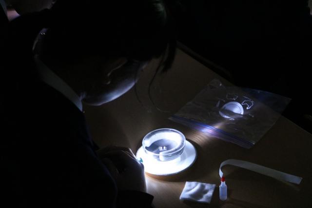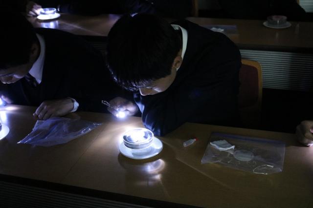 1限目は放射線の利用について日常での活用例からはじまる様々な基礎知識を学んだ後、ドライアイスを使った実験を通して「私たちが見ている雲はいったい何なのか」を考えました。2限目はその実験内容を前提に放射線が空気中を飛んでいることを間接的に観察できる「簡易霧箱」という装置を各自が作成しました。まずはじめに線源を利用して観察します。目の前に現れる放射線の軌跡に生徒たちからは歓声が上がり、笑顔が見受けられました。つぎにこの装置を活用して「放射線の半減期」を体験しました。この実験で「私たちが見ているもの」「放射線について」の理解が深まり、また難しい内容をわかりやすく目の前で見ることはとても印象的な学習になりました。講義の最後には、これからの時代を担うべくどのように「放射線の関わる様々な事象」に向き合っていくのか個々の姿勢と意識を見つめ直すお話をいただきました。先生の熱いメッセージには学ぶところが大きく、生徒たちは自分事として真剣に聞き入っていました。