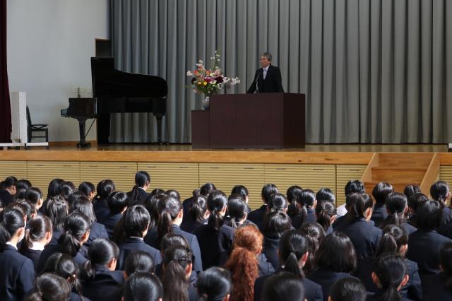 4月9日(月)に始業式・対面式が行われました。始業式では、女子ソフトテニス部と硬式野球部の試合報告がありました。女子ソフトテニス部は、第 43 回全日本高校選抜ソフトテニス大会で2年連続、3回目の全国優勝という快挙を成し遂げました。硬式野球部は、第90回記念選抜高校野球大会において、1969年の第41回大会以来49年ぶりにベスト4に入りました。また、校長先生より訓辞をいただき、中学校・高等学校の校歌を合唱しました。対面式では、在校生と新入生が向き合い、新入生代表の挨拶と、在校生代表の歓迎の言葉がありました。