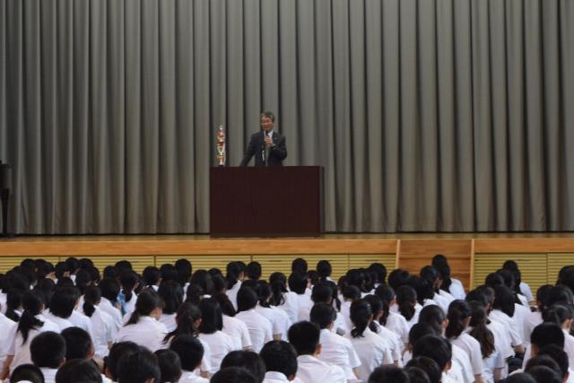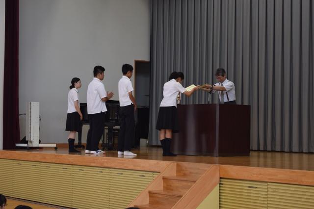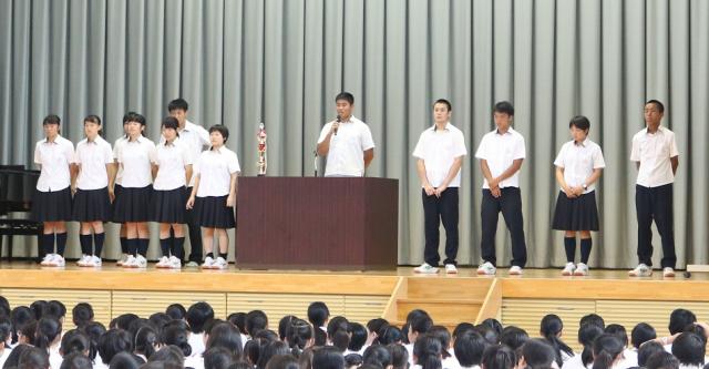 7月20日(金)に1学期終業式が行われました。猛暑のため、タオル、水筒、うちわを持参し短時間で行いました。高校壮行会、校歌、音楽部の発表、伝達表彰を行い、無事終了しました。