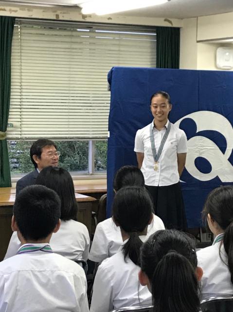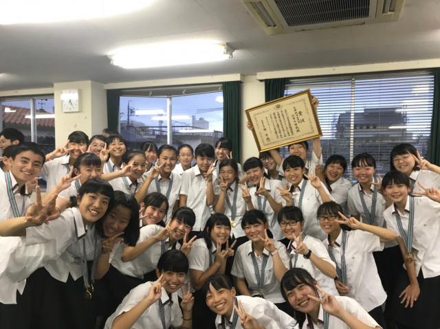 三重中ダンス部の全34人が11日、殿町の市教委を訪れ、竹上真人市長に喜びを報告しました。竹上市長からねぎらいの言葉を受け、顧問も部員も改めて喜びを噛みしめていました。