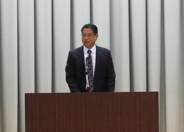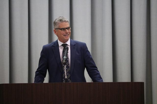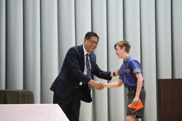 セレモニーでは、本校の理事長の歓迎の言葉と姉妹校提携30年の歴史の説明に続いて、Campbell校長からもお祝いの言葉と本校生徒の皆さんに「新しい世界と自分の可能性を見つけるために旅に出なさい」との激励の言葉をいただきました。生徒代表として4A堀越光春さんによる歓迎の言葉が英語で述べられ、その後Zachary Dunnさんから日本語の挨拶を頂きました。