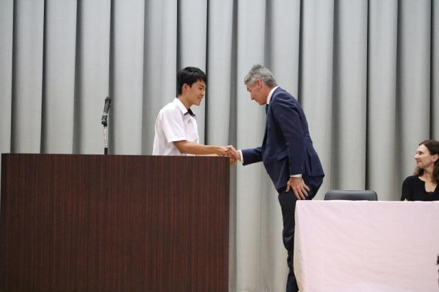![]() 本校生徒代表とAGCS学校長の握手 |