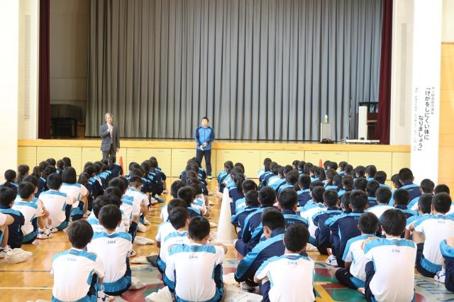 10月22日(月)、鈴鹿回生病院から理学療法士坂口弘樹先生をお招きし、中学2年生を対象に「保健講座」が行われました。「けがをしにくい体になりましょう」というテーマで座学と実技を取り入れた講座を受けました。