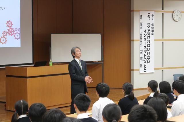 10月25日(木)、反差別・人権研究所みえから中村尚生先生をお招きし、中学3年生対象に保健講座の講演会が行われました。高校生になるにあたり、スマートフォンの使い方、特にSNSの問題を中心に話をしていただきました。