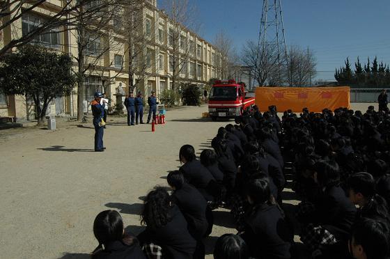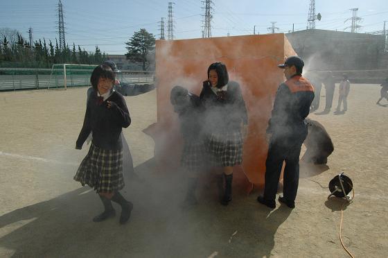 2月7日(土)、松阪南消防署から4人の職員の方に来ていただき、消防訓練を行いました。避難訓練の後、グラウンドで消火器を使っての消火訓練と濃煙体験がありました。濃煙体験では特設のテントの中に発生させた煙の中を歩きましたが、一歩先が見えないところを進むという貴重な体験ができました。訓練の後、職員の岡本さんから実際の消防活動の体験を踏まえた講話がありました。17年勤務されたベテランの岡本さんの「今でも煙はこわい」という言葉に身が引き締まる思いがしました。