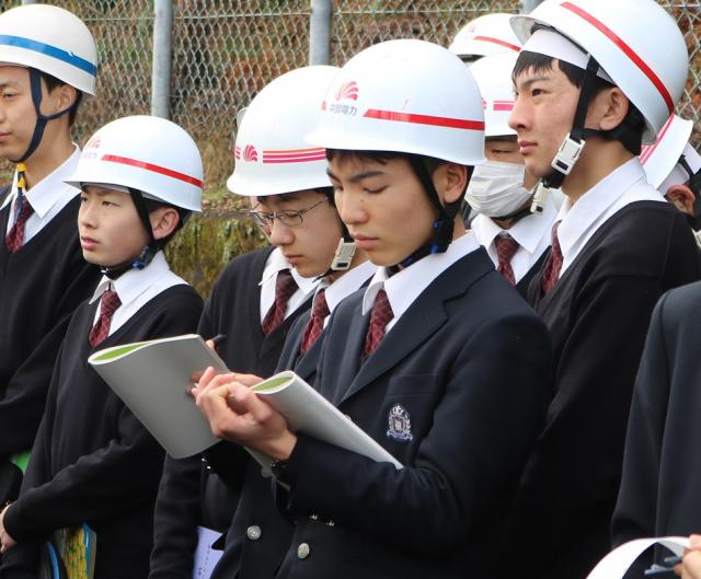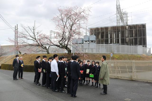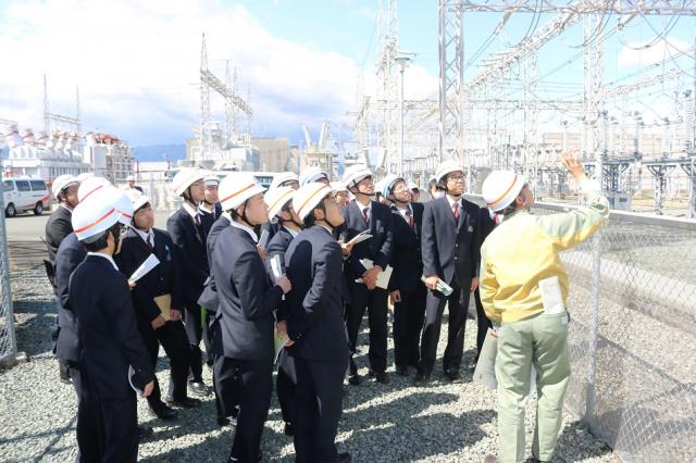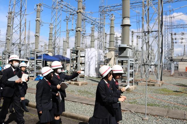 事前授業では、交流・直流の性質や変電の原理、送電時の電力損失について学び、身近だけど知らない送電線の仕組みなどに、生徒たちはとても感心している様子でした。変電所見学では初めて見る機器類に興味津々で、講師の方の話にうなずく姿がたくさん見受けられました。まとめの講義では、鉄塔の高さや名古屋城の下に変電所があることを聞き、驚いていました。また、実物の電線のカットモデルに触れさせて頂き、意外に重いことなどいろいろな発見をしている様子で、その後、質問がたくさん出ました。