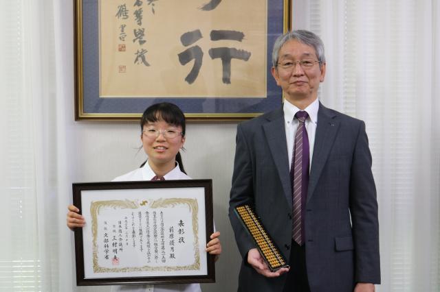 本校1年生の前原優月さんが「第215回日商珠算能力検定試験」で1級に満点で合格し、賞状と盾を受け取りました。前原さんは小学校2年生の時に1級に合格していましたが、今回12回目の挑戦で念願の満点合格となりました。全国で9018人が今回の試験を受験し、2430人(合格率26.7%)が合格しました。松阪市内で1級に満点合格したのは前原さん一人でした。前原さんは「珠算の練習で身に着けた集中力や根気強さで、今後もスポーツや勉強などを頑張りたい。」と喜びを語りました。