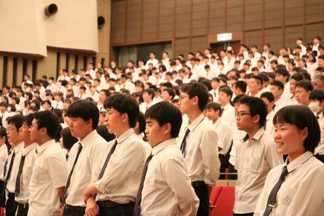 ![]() 演奏に合わせて校歌を合唱しました(高校) |