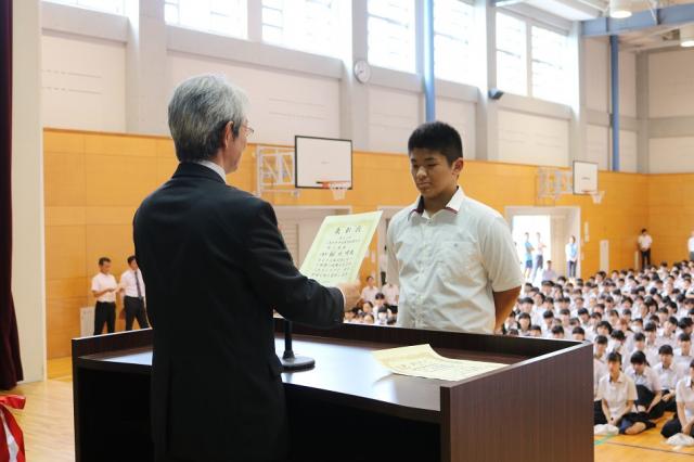 その後伝達表彰式がありました。第42回三重県中学校相撲大会では個人優勝が一名、卓球部は一部の生徒が中部日本卓球選手大会に出場が決定しました。第60回外国人による日本語弁論大会では一名の生徒が主催団体賞という名誉ある賞を受賞し、アーチェリー部は男子団体3位 女子団体2位となりました。