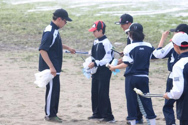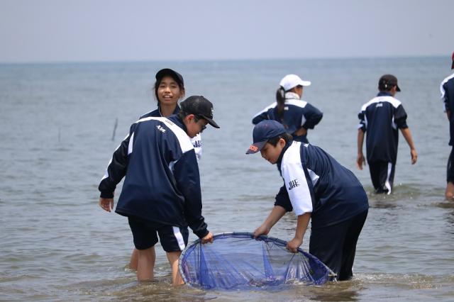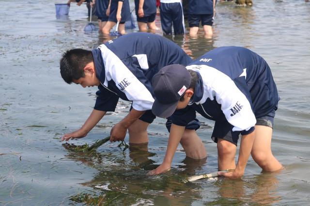 生徒たちは、新たな見方を発見し、たくさんのことに気付いていました。海や干潟に入り生物を捕まえるだけでなく、その種類や環境を考察することで、こんなにも生物がいることに驚いたり、私たちにとってきれいな海が漁業者の人にとってきれいな海ではないことを知ったりなど、それぞれ新たな海に出会いました。そして、活動の最後には、皆が来たくなる海にしようと願いを込めて清掃活動を行いました。また、今回の学習を繋げていくべく学年全体で疑問点を寄せ、探究活動を行い、学園祭での展示・発表に活かしていく予定です。