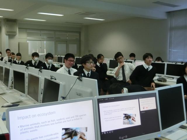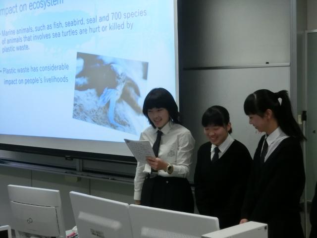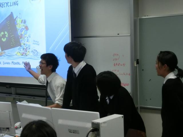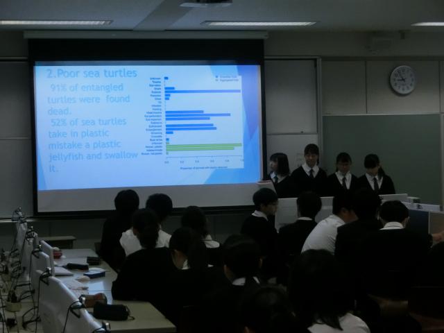 4年生の英語表現の授業で"Marine Pollution (海洋汚染)"についてのプレゼンテ−ションを行いました。4人がグループになり、テーマを決め、現状の理解を進めました。マイクロプラスティックの問題、汚染物質の生物学的な影響、福島の原発から漏れ出た放射能による海洋汚染などをテーマなどを取り上げ、それぞれが解決案を提示して、プレゼンを終えました。プレゼン原稿の作り方なども含め、お互いのプレゼンから学ぶことが多い授業になりました。